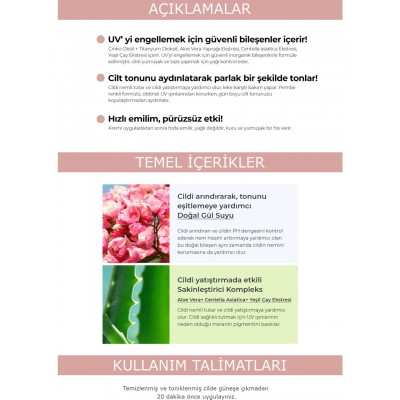 İçindekiler; Water, Titanium Dioside, Tressecaprillan, Ethylhexyl Methowreimmamate, Zinc Oxide, Paraffinum Liquidum, Cyck methicone, Butyl Methoxydibenzoylmethane, Caprylokapric Triglyceride. Thatylene Glycol, Niacinamide, Propylene Glycol, Glycerin, Cetyl PEG/PPG-10/1 Dimethicone, Sorbitan Sesquiolete, Butyrospermum Parkii (Shea) Oil, Sodium Chloride, Beeswax, Sodium Hyaluronate, Microcrystalline Beeswax, Anthemis Nobilis Raw Flower Extract Hazel) Extract, Aloe Barbadens Leaf Extract, Centella Asiatica Extract Rosa Centifolia Flower Water, Camellia Oil-Free Appearing Extract, Collagen Extract, Snail Secretion Filtrate. Adenosine, Chlorphenesin Tenoxyethanol, Fragrance
